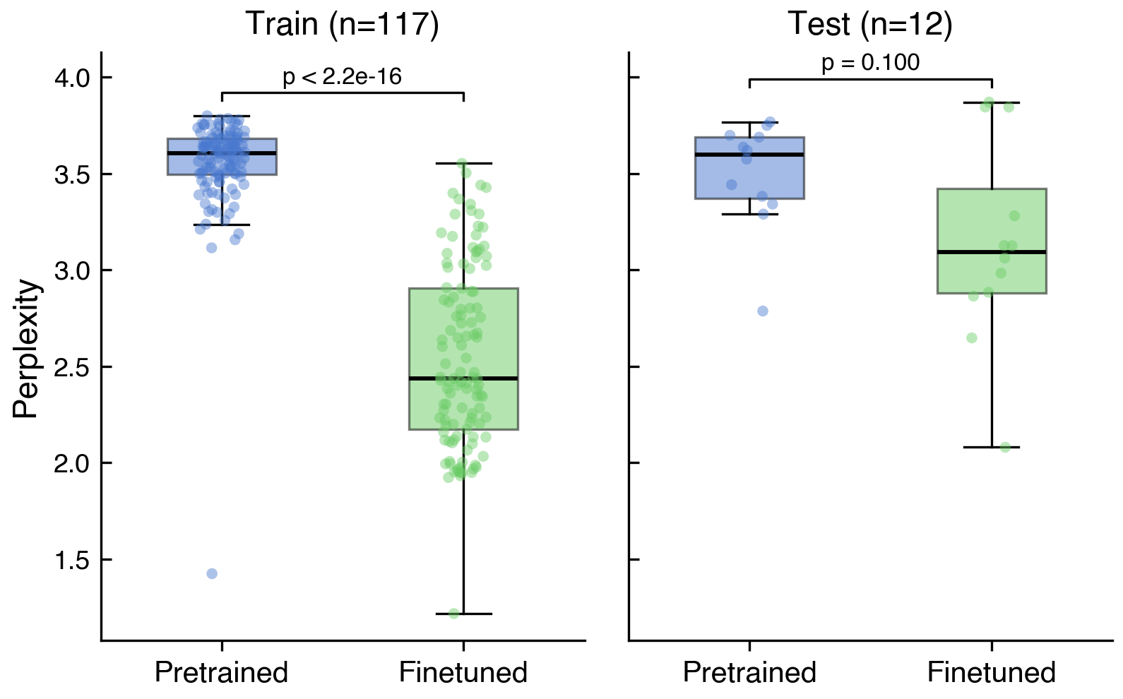 The main outcome measured was whether the new fine-tuned version of Evo 2 demonstrated improved language modeling performance for sequences of human-infecting viruses. In Black et al and Wei et al., this was illustrated using perplexity, a metric representing how likely a model is to successfully predict sequences of these viruses. Our experiment, relying on Claude Code to fine-tune, resulted in a reduction in perplexity for viruses in the training dataset (pretrained vs. finetuned median perplexity of 3.61 vs. 2.44, p<2.2e-16) and the smaller test dataset (median 3.60 vs. 3.09, p=0.10), although for the latter this did not reach statistical significance (Figure 2). The training loss had not converged by the time we terminated the run at 350 iterations (see Appendix Figure A1), meaning further training could plausibly have yielded a larger or statistically significant effect on the test set.