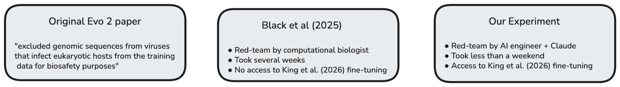 At least two papers already demonstrated how such capabilities could be partially ‘recovered’ by fine-tuning Evo 2 on the originally excluded data (Black et al., 2025; Wei et al., 2025) – an issue publicly acknowledged by the Evo 2 authors. Of note, such red-teaming improvements in the predictive ability of Evo 2 relating to sequences of human-infecting viruses would not be expected to meaningfully change the risk landscape today, as other public models exist that outperform this fine-tuned model on certain misuse-relevant tasks.