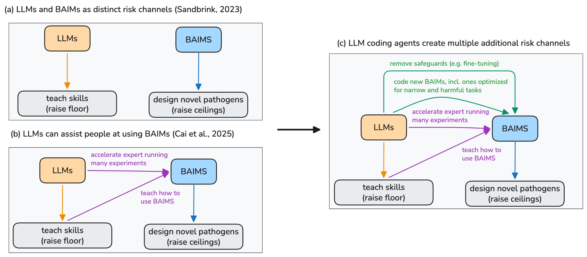 The biosecurity community initially divided risks from AI into two groups: large language models (LLMs like ChatGPT) that "raise the floor" by making dual-use biological knowledge more accessible to novices and biological AI models (BAIMs like AlphaFold) that "raise the ceiling" by enabling experts to design more dangerous pathogens (Sandbrink, 2023).